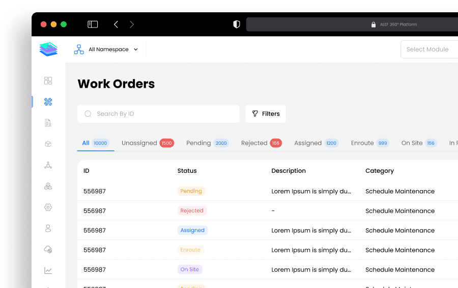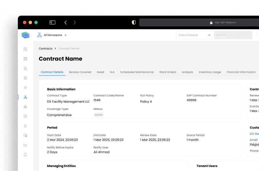 Simplify and automate the full work order cycle—from request to closure. Track tasks in real time, boost SLA performance, comply with contractual obligations, and optimize preventive maintenance to prolong asset lifecycle and mitigate unexpected breakdowns.
