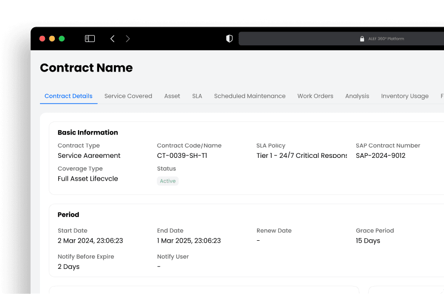 - ربط المستندات الداعمة (مثل اتفاقيات مستوى الخدمة (SLAs)، والتعديلات، وشهادات الامتثال) لضمان التتبع الكامل.