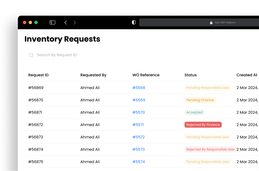 - مستويات إعادة طلب قابلة للتخصيص وإرسال إشعارات فورية بانخفاض مخزون قطع الغيار والمواد الاستهلاكية.