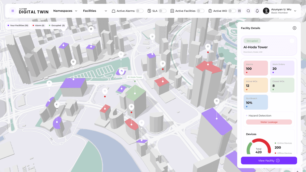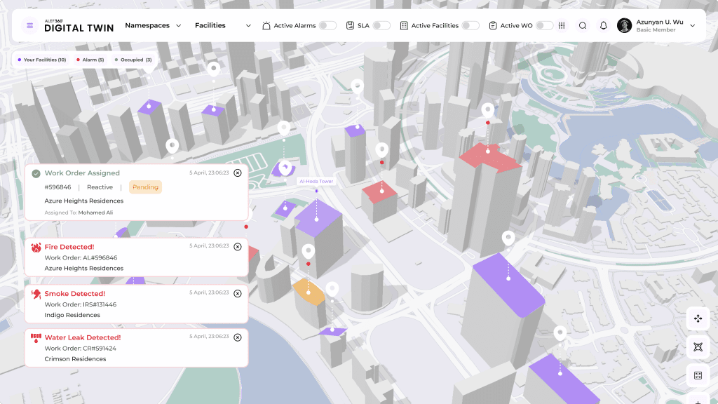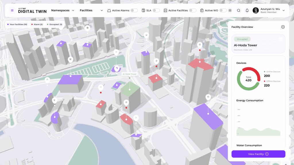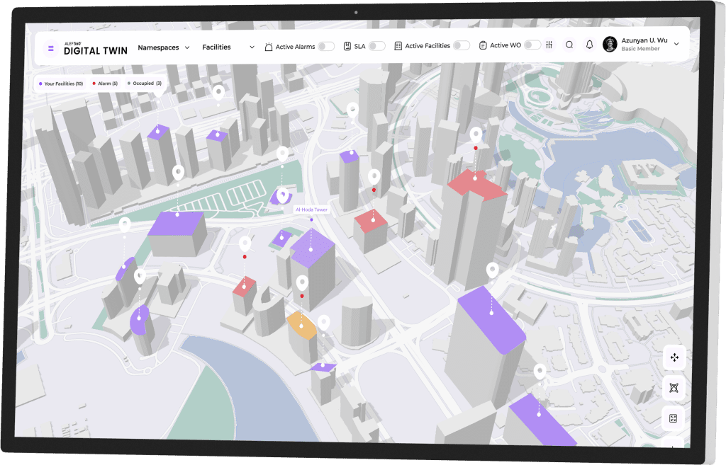 بالنسبة لمالكي الأصول الذين يديرون عقارات كبيرة وموزعة، غالباً ما تبطئ البيانات المشتتة من عملية اتخاذ القرار. يضع نظام التوأم الرقمي (Digital Twin) من ALEF 360° كل شيء في مجال رؤيتك—حيث يربط بصرياً الأصول والأنظمة والبيانات المكانية عبر مبانيك. وهو يدمج المدخلات الحية من وحدات ALEF 360° لإنترنت الأشياء (IoT)، ونظام إدارة المباني الذكي (iBMS)، ونظام إدارة المرافق بمساعدة الحاسوب (CAFM) / نظام إدارة الصيانة المحوسب (CMMS) في طبقة تفاعلية، مما يساعدك على تقييم الظروف وفهم السياق وتصور الأداء الواقعي بطريقة سهلة الاستخدام وبديهية.