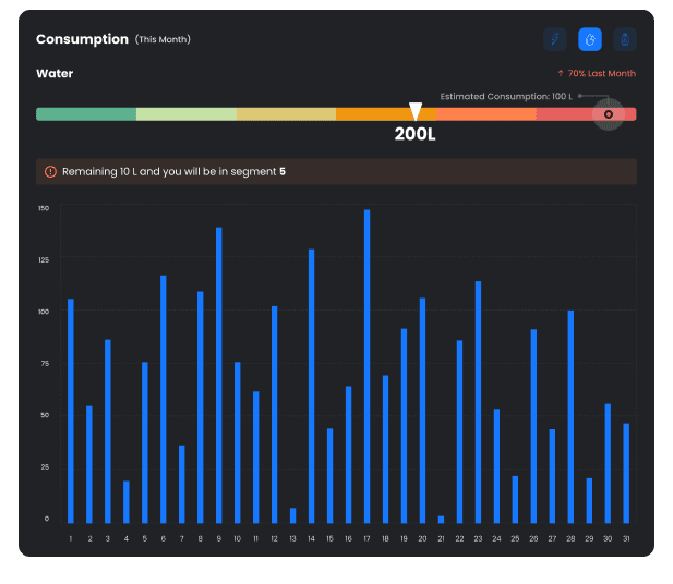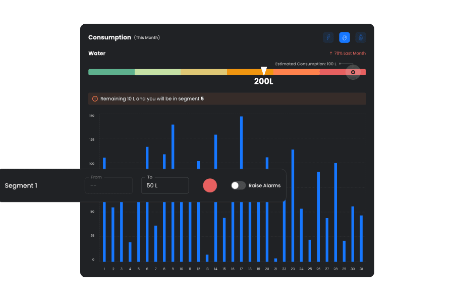 يُزودك حل قياس المياه من Ignite Meter بأدوات تحليلية فعّالة تُحوّل بيانات الاستهلاك إلى رؤى عملية. حدّد أوقات ذروة الاستخدام، واكتشف التسريبات، وافهم استهلاكك للمياه بشكل لم يسبق له مثيل.